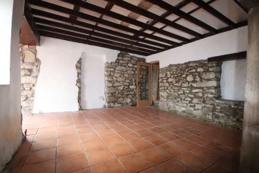Living room: 15’10” x 13’6” – with exposed stone walls, ceramic tiled floor throughout, original high-top cottage-style fireplace with wooden railway sleepers to surround and mantle.