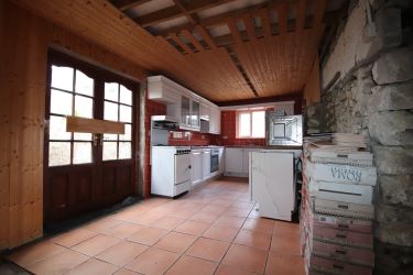 Kitchen / Diner: 19’4” x 9’3“ – with white gloss wall and base units, glass display cabinets, wood effect formica worktops, fitted stainless steel sink with polished steel centre tap, built-in oven and (4) x ring electric hob, plumbed for washing machine, wooden panelled ceiling, featured exposed stone wall, ceramic tiled floor, double glass panelled to rear, tiled splashback, freestanding copper cylinder tank.
